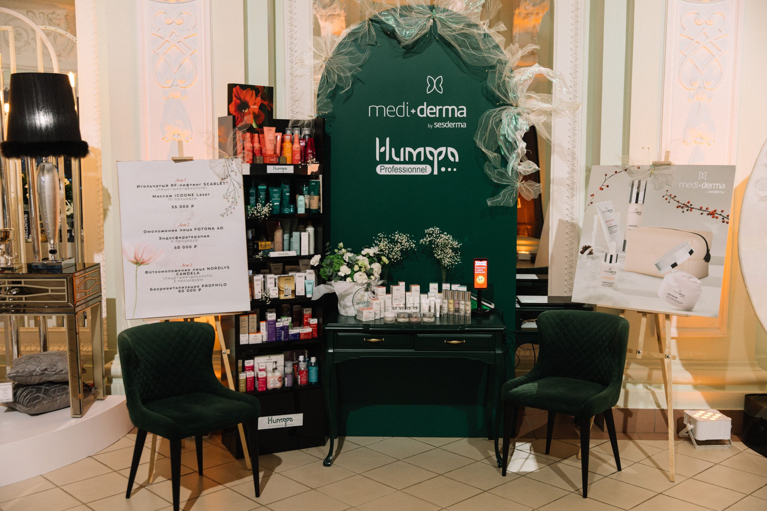 Праздничную атмосферу вечера поддержали парнёры, среди которых сеть салонов «Нимфа» представила линейки профессиональных брендов косметики AVEDA, SESDERME, MEDI DERMA. На стенде компании гости могли познакомиться с продуктами.